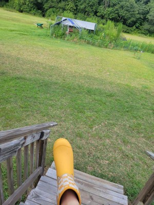 Muck Boots best selling all-purpose Muckster shoe now available in Mid height; the Muckster II. These women's 10-inch pull-on booties offer all day comfort wherever you go. Roll them down and they become a shoe! They will keep your feet warm with 4mm of Neoprene and 100-percent dry on those cool, wet mornings. This casual style, in a yellow farm print, offers a new high traction, rubber outsole and that provides traction on wet surfaces and easily sheds debris. Whether you're in the garden, running errands, or walking the dog, you'll enjoy these booties..