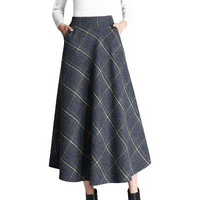 LEVEN SIXTEEN Women's Wool Plaid A-Line Skirt - Winter Warm Elastic Waist Pleated Long Skirt Plaid Brown Plaid Brown Large