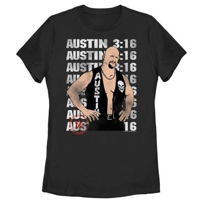 Strut your stuff with this stylish new women's t-shirt that is perfect for every occasion! Featuring a shattered "Austin 3:16" logo above a photo of Steve Austin with his arms up.