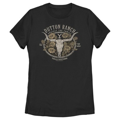 Women's Yellowstone Cow Skull and Flowers Protect The Family T-Shirt - Black - Medium