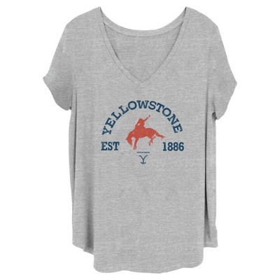 • Enjoy comfort and fashion at the same time with this unique juniors' graphic V-neck plus size tee design from Yellowstone.