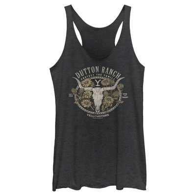 Get ready to head back to the West to watch the Dutton Family endure the dangerous and complicated ordeals of 19th-century Montana ranching life in this officially licensed Yellowstone Sunset Dutton Ranch Cow Skull Women's Graphic Racerback Tank Top! This unique design features a large skull with the Dutton Family Ranch symbol on its forehead and the words "Dutton Ranch, Yellowstone, Est. 1886." printed across the front. Show your love for Yellowstone with this apparel today!