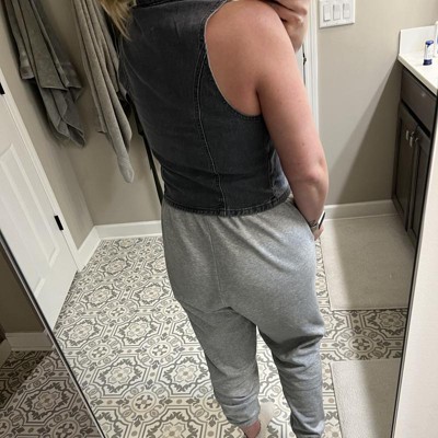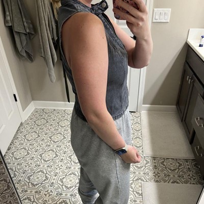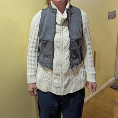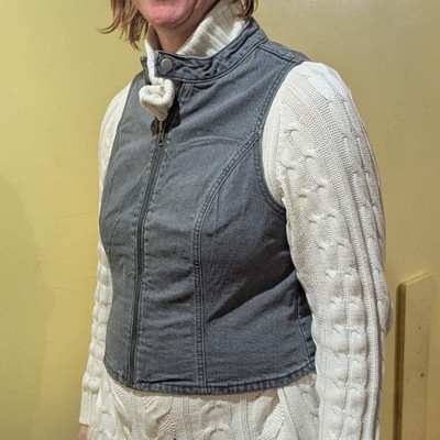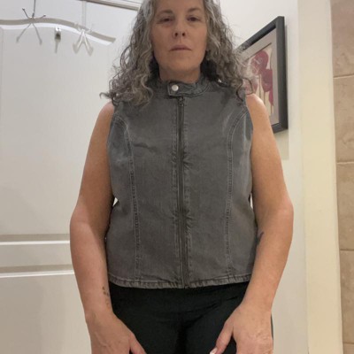 [This review was collected as part of a promotion.] This zip up vest in size S fit true to size. It was pretty cropped hitting to just under the waist. It’s a denim material and medium weight. It zipped up easily and buttoned at the top and the high neck wasn’t bothersome. The gray wash looks nicer than the light wash color option that I tried. Pair with leggings and heels or jeans and boots. Overall I thought it a decent style. For reference, I’m 5’4” and measure at 32-28-38. I received an incentive to write this review.