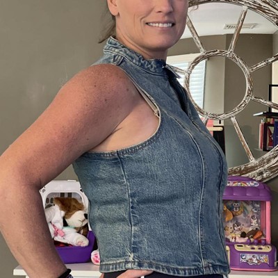 [This review was collected as part of a promotion.] This denim vest fits like a glove. I am typically a size large in tops and that is what I tried on. I am 5 feet 7 inches tall and I think the length is perfect, not cropped. I like how the seaming gives a slimming illusion. The detail of the snap at the neck looks so edgy. You could wear this alone or later with a bodysuit or long sleeve top, dress it up with a skirt or wear with jeans for a casual look. I received an incentive to write this review.