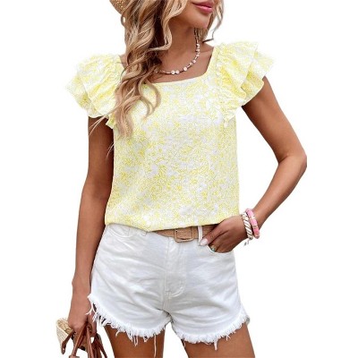 Womens Bow Tie Back Tops Round Neck Ruffle Short Sleeve Shirts Cute Babydoll Chiffon Summer Trendy Tunic Yellow?XL