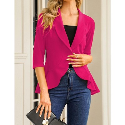 3/4 sleeve office blazer jacket, basic shawl collar, black blazer for women, open front with a single front button, ruffle hem, slim fit jacket suit, solid color/plain, no liner or shoulder pads.