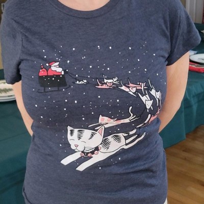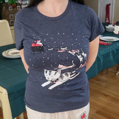 Womens Cat Reindeer Sleigh T Shirt Funny Santa Christmas Holiday Party Tee - Crazy Dog Women's T Shirt Gift For Christmas Navy M