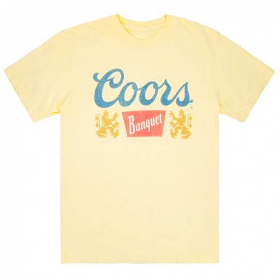 Officially licensed Coors Banquet Golden Women's Crop Top T-Shirt. This golden "Coors Banquet" Women's Crop Top T-Shirt is made from cotton and features a classic "Coors Banquet" logo on the front.