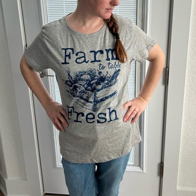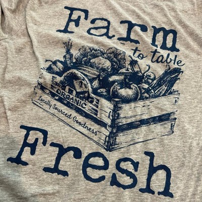 [This review was collected as part of a promotion.] I love the Farm Fresh graphic on this shirt. The design is modern and the message is great as well. The design seems well adhered and I like the textured feel. I typically wear either medium or large and I like the way this large fits - just a tad oversized and very comfortable. The fabric is soft and lightweight and it feels great to wear!
