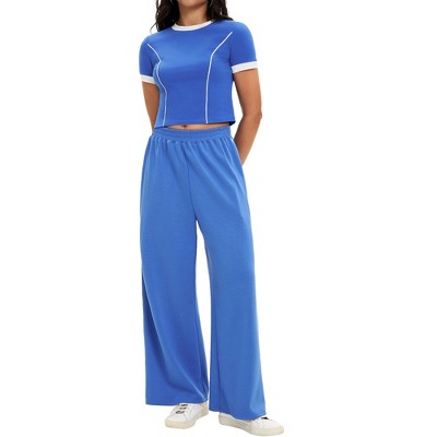 Good part was delivered earlier than expected. Bad, color is not navy blue, but a purple-blue color. Top is made poorly. Shoulder area is extremely large, while tummy area is very narrow and short. Pants are poorly made, look very cheap. Waistband is extremely wide, and top of legs are gigantic. The picture looks super nice and classy, but this is deceiving. Big disappointment.