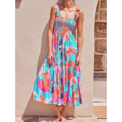 - This women's dress features a halter neck and sleeveless cut, paired with a smocked back for a flexible fit. The flared maxi silhouette adds flow, perfect for garden parties.
