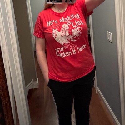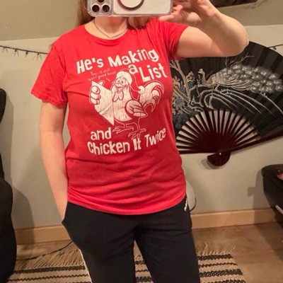 Womens Hes Making A List and Chicken It Twice T Shirt Funny Xmas Rooster Santa Joke Tee for Ladies - Crazy Dog Women's T Shirt Gift For Christmas L