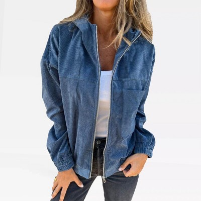 Womens Jackets Corduroy Zip Up Hooded Jacket Pocket Elastic Hem Casual Coat