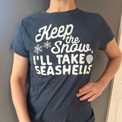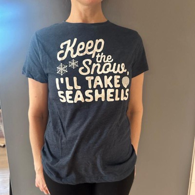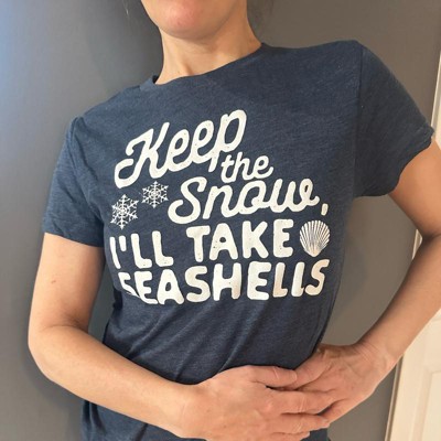 Tropical Escape Theme: Features the humorous phrase “Keep the Snow I’ll Take the Seashells”; ideal for winter getaways, holiday cruises, and snowbird beach lovers; showcases a playful seashell design for sunny style