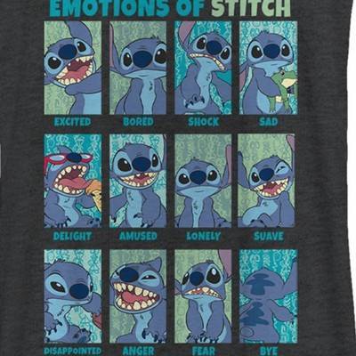 Ohana means family, and that means no one gets left behind with this officially licensed Disney Lilo & Stitch Emotions of 626 Women's Graphic Racerback Tank Top! This adorable Women's tank design features the text "Emotions of Stitch," with many panels showing his different moods like exited, disappointed, lonely, bored, sad, delight, amused, fear, and bye. Your popularity will skyrocket once you wear this new graphic tank, so grab one for yourself today!