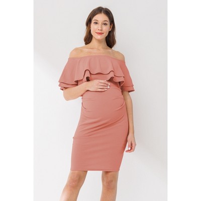 Womens Maternity Summer Casual Flutter Short Sleeve Smocked Dress Crew Neck Tiered Midi Dress Baby Shower Photoshoot - 1 of 4