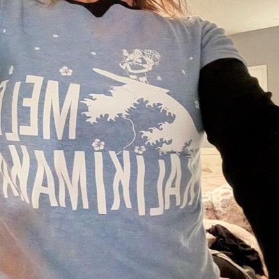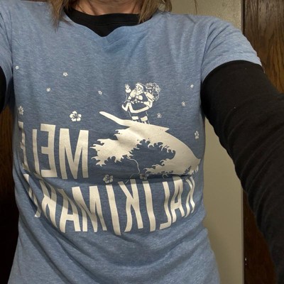 Tropical Holiday Design: Features a surfing Santa with a Mele Kalikimaka print that brings cheerful island inspired style to your winter outfits; ideal for relaxed gatherings, themed parties, or adding a fun tropical twist to your seasonal wardrobe