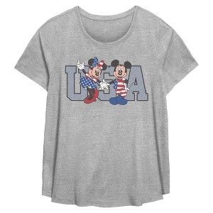 • Light up your look with this festive women’s plus size scoop hem t-shirt perfect for Fourth of July celebrations and everyday style! Featuring Minnie and Mickey and the word "USA" in the background.