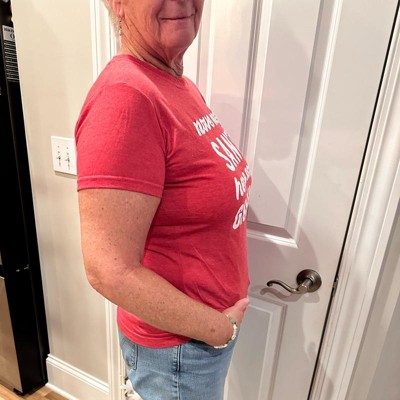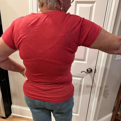 [This review was collected as part of a promotion.] I ordered this shirt for my mom in a women’s size x-large. The design on the shirt is really cute and perfect for a grandma who loves to dote on her grandkids. Unfortunately there were some issues with the shirt. The material is soft but pretty thin, though I like the heathered red color. The fit of the shirt is off as well. My mom typically wears an x-large in all her shirts, but this was very form fitting on her. It is more fitted than she is comfortable wearing.