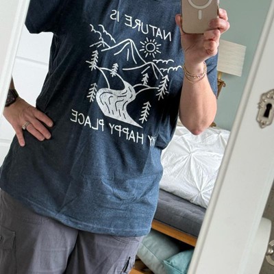 • Love for the Outdoors: Show your nature-loving side with this funny women’s t-shirt featuring “Nature Is My Happy Place” and a mountain trail design; perfect for hikers, campers, or anyone who finds peace in the wild.