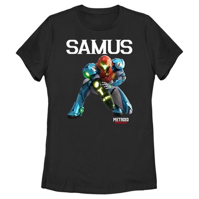 - Defeat your enemies across space and claim intergalactic rewards with this women's graphic t-shirt design! Featuring a cool full shot of Samus posing across the front.