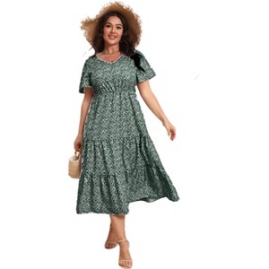 Plus Size Boho Dress Womens Plus Size Casual Dresses Wrap V Neck Maxi Dress with Belt Tiered Flowy Boho Long Dresses Green--X-Large