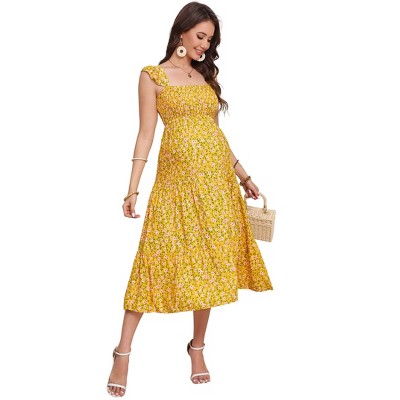 Womens Plus Size Casual Sleeveless Maxi Dress Ruffle Sleeve A Line Swing Summer Maxi Dress with Pockets Yellow Small Flowers 4XL