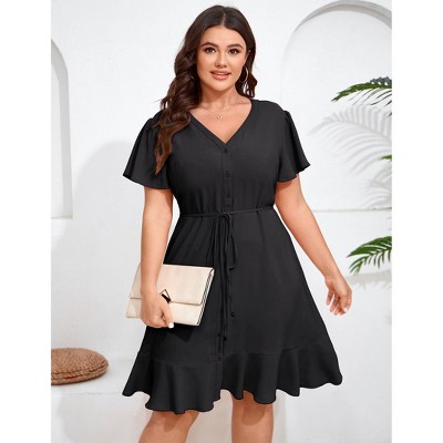 Womens Plus Size Sweater Knit Dress Long Sleeves Square Neck Tie Front Casual Midi Pullover Dress with Pockets,Black,4XL