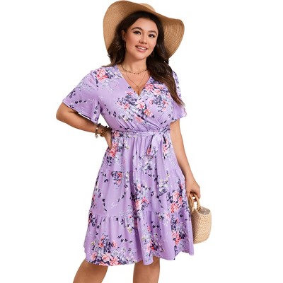 Womens Plus Size V Neck Summer Dress Layered Floral Print Long Maxi A Line Boho Dress Purple Floral 4XL