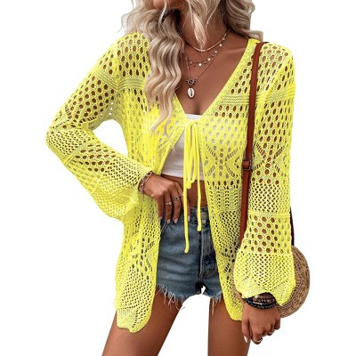 Womens Summer Lightweight Crochet Cardigan Long Sleeve Open Front Beach Swimwear Cover Up