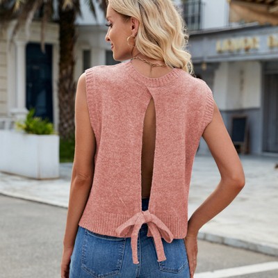 Womens Summer Sweater Vest Top Casual Crop Knit Cardigan Vest Bow Tie Back Knitted Sleeveless Round Neck Tank Tops Pink M