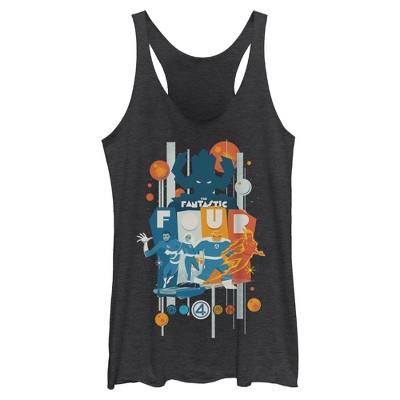 • Experience the dawn of a universe with this chic women's racerback tank top that is perfect for battling cosmic threats! Featuring the bold silhouettes of Human Torch, The Thing, Invisible Woman, and Mr. Fantastic in fiery red, rocky orange, radiant white, and brilliant blue, each hero with their iconic number "4" symbol.