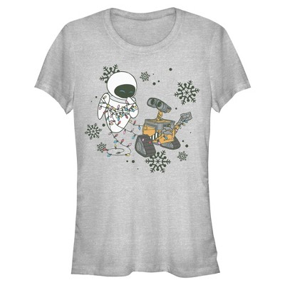 - Strut your stuff with this stylish new women's t-shirt that is perfect for the holidays! Featuring Eve and Wall-E surrounded by snowflakes printed across the front.
