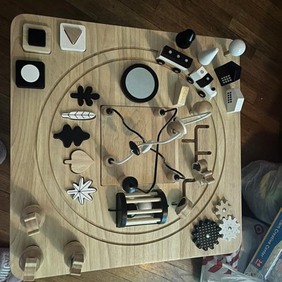 What could possibly be more awesome than our all new Awesome Activity Table? It’s loaded with lots of fun stuff including 3 removable stacking toy animals, a mirror a shape sorter puzzle, train set, and so much more. The center maze pulls up to reveal a cotton storage bag to keep things tidy. Legs screw on and off easily to hide away under a bed or in a closet. Great for babies learning to stand. Neutral design fits into any room, and will delight your little one for hours! Rubberwood, cherrywood, non-toxic water based paint, and 100% cotton bag add to the quality of this awesome toy.