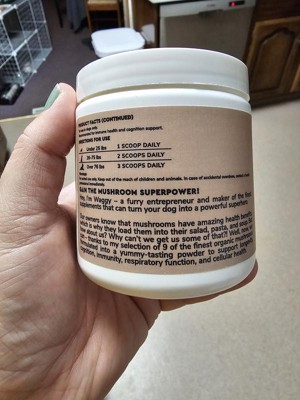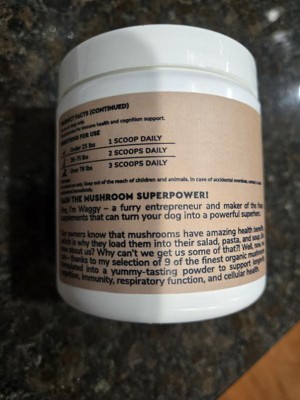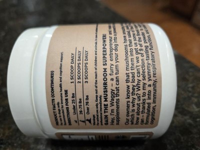 Mushroom supplement for my dog was very messy to mix in with dry dog food, also my dog wasn't very thrilled with the taste in her food so I wouldn't buy this again. There is alot of the powder in the container.