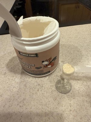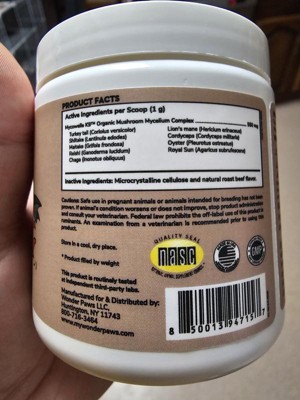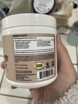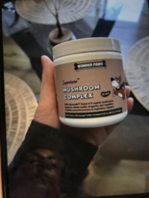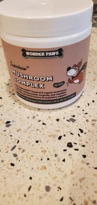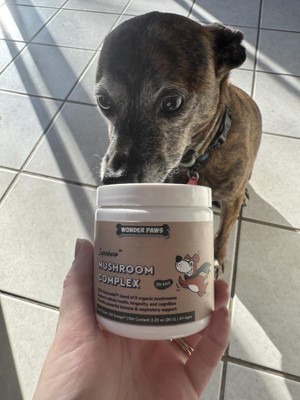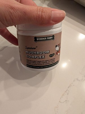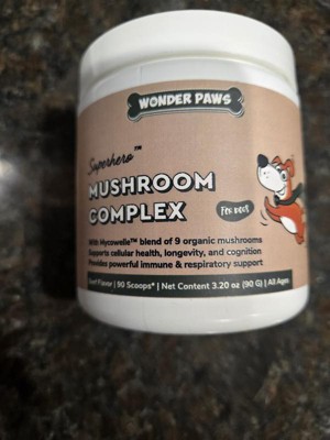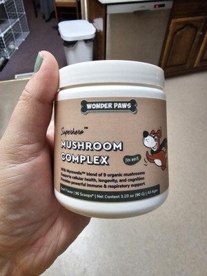 Wonder paws mushroom complex is a powder that promotes cellular health and longetivity. Supports respiratory and immune health for dogs. I have been using the powder twice a day by sprinkling it on my dogs food. Usually with a mix of dry dog food and some protein for healthy coats and full doggies. They are usually pretty happy with their food and have had no complaints or change in their bowel movements.
