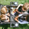 We appreciate how the snack tray can expand by flipping out the cup holders. It keeps snacks and toys contained. If we also want to eat at a picnic table or on the ground, it’s great that we can detach it from the wagon and utilize it as a serving platter.