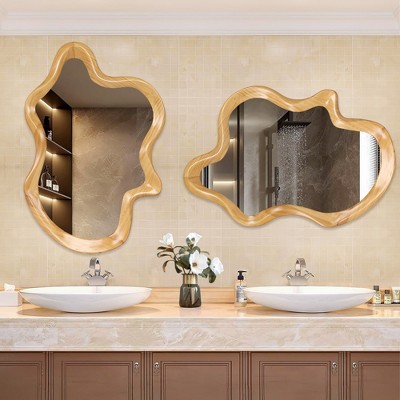 This mirror is a stylish and functional addition to any home, featuring a uniquely shaped solid wood frame and high-definition glass that offers super clear, distortion-free reflection. Perfect for your bathroom, vanity, or living space, it not only serves as a practical piece for daily grooming but also acts as a decorative accent with its intricate design, while being easy to clean and blend into various decor styles.