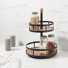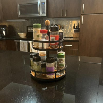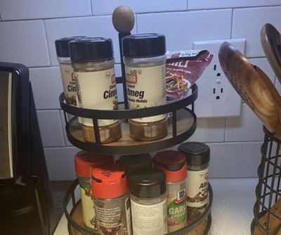 Keep your kitchen cabinets tidy and efficiently organize your counter space with the Wood 2-Tier Round Spice Rack from Threshold™. Made from metal with a wooden base, this two-tier spice rack features two round levels to let you store and keep a variety of spices at hand to bring efficiency to your everyday cooking chores. Supported on a rotating base, it offers you easy access to the needed ingredient, thus saving time on rummaging through cabinets. In a black metal finish with natural wooden base and an oval accent at the top, this spice rack instantly adds elegant style to your kitchen decor.