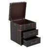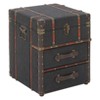 - •Upholstered side table features a vintage inspired chest with drawers adorn with bolted leather straps, rivet detailing and latch lock mechanism at the top for additional storage space
