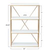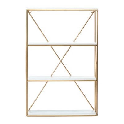 This versatile wall shelf offers storage and display for plants, books, trinkets, and treasures. With four white shelves set in a gold finish iron frame, mount this shelf to any wall to maximize storage in small spaces. As functional as it is pretty, use in your entryway, kitchen, office, or bathroom to stash essentials or to highlight your favorite things. Includes 2 eyehooks for easy mounting.