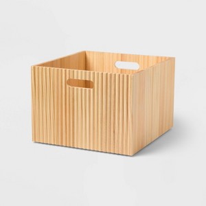 Keep your bath space elegantly organized with the Wood Bin from Brightroom™. This large bin is designed in a rectangular shape with an open top for easy organization of clothing, toys, shampoo, and other items. Made of wood, this rectangle bin features a ribbed-like design at the front for a touch of artistic style. It comes with a cutout handle to make it easy to pull out the bin. You can place it on the tabletop, a shelf, or any flat surface.