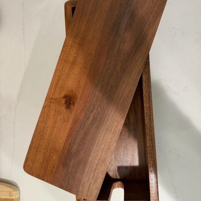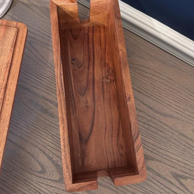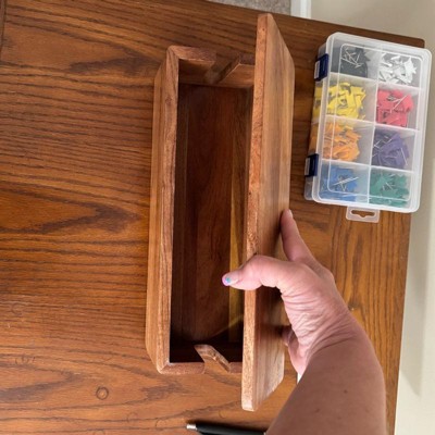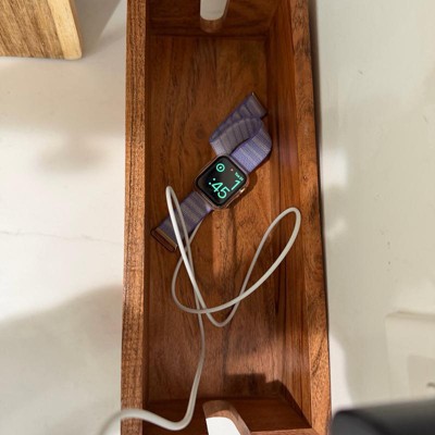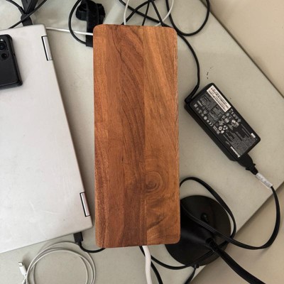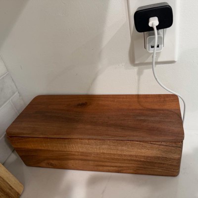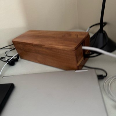 I really like this for my kitchen countertop where we seem to always have something charging. It has holes on both of the long sides so you can have an in and an out. It is solid wood and a beautiful warm color. My only complaint for something at this price point is the the lid does not sit straight it rocks a bit. I’m not sure if it will hold up to seasonal humidity changes if it is already warped.