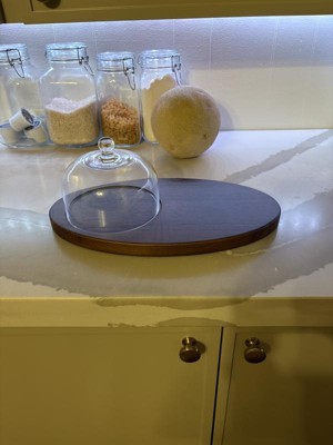 The Hearth & Hand™ with Magnolia Wood Cheese Board with Cloche adds elegance to any occasion. This wooden board measures 5.94 inches long by 8 inches wide and can display a variety of delicious foods. The flat part of the board is smooth and solid. The beautiful Cloche has a pointed handle for easy lifting and rests on an indented circle of the board. You can store softer foods inside the glass dome to keep them fresher longer. I like to refrigerate my Cloche before serving my softer cheeses. When I am not using this as my Charcuterie Board, I keep it as a centerpiece on my table. This is a well-made, quality piece. The wood is durable and can be easily cleaned. The glass is thicker, and I often place it on the top rack of my dishwasher. I am extremely happy with this board, and I receive numerous compliments on it.