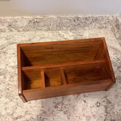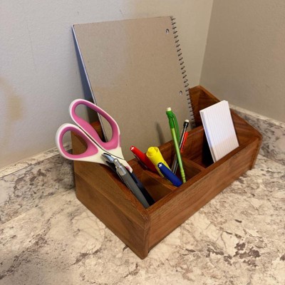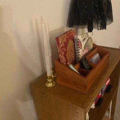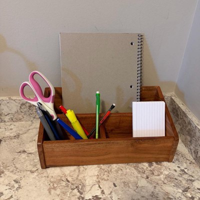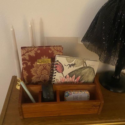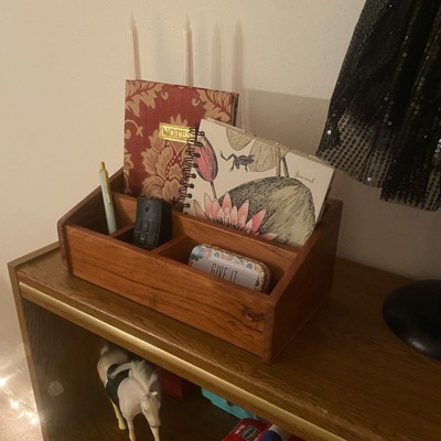 This is a beautiful wooden organizer. It’s perfectly sized and holds everything nicely. It’s excellently made, very sturdy and really good quality. I am using it to hold my stationary items and it’s perfect for what I need it for. It easily holds my journal books, as well as my pens and my light remotes and everything else that I need. I love it!