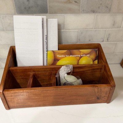 This is going to be great sitting in my counter to hold the few pieces of mail that come that need action. Several sized compartments allow for organization and hopefully limit the chance of it becoming a junk collector because it is rather small. Made of solid wood and seems to be decent quality. I plan on adding some thicker felt feet at the bottom as the ones it came with are super thin, but otherwise it’s great.