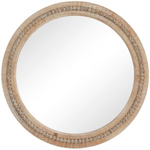 - Large size round wall mirror featuring a reflective glass panel and brown whitewashed frame embellished with charming bead details