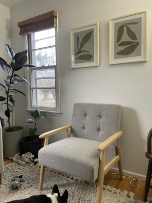 This gray fabric chair with wood arms and legs has become a welcome addition to my living room. It was a breeze to assemble, which is always a plus! Now my living room boasts an extra comfy spot to relax and unwind. Whether I'm curling up with a good book or providing extra seating for guests, this chair provides the perfect balance of comfort and style. The gray fabric complements any decor, and the warm wood tones add a touch of sophistication to the space. I highly recommend this chair for anyone looking for a stylish and functional addition to their living room! I've had the chair for a few months and it's held up really well to both human use and two dogs using it for a spot to nap. I'd highly recommend this if you're looking for a chair for an office or living room!