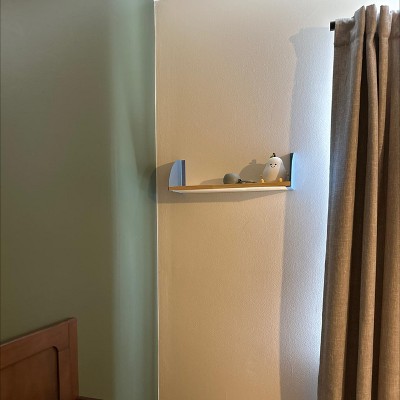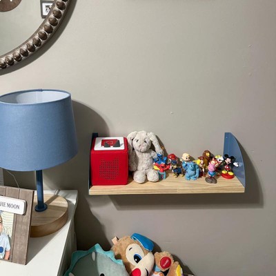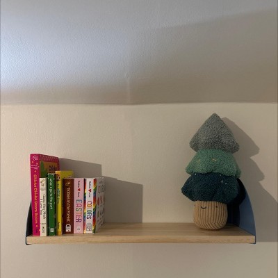 Optimize wall organization in style with the Wood Shelf with Metal Brackets from Pillowfort™. Versatile natural wood pairs with deep blue metal in an artful arched shape for versatility that is unique yet timeless. A great display piece, this shelf with metal brackets features a 21-inch-wide shelf that holds books, decorations, photos, plants and more. Plus, it adds a touch of soft color to any wall. Pair multiple shelves together for a statement wall to revamp your kid's room or playroom.