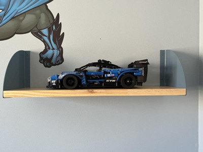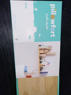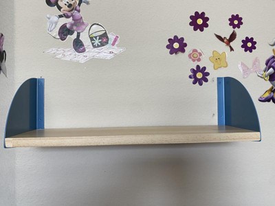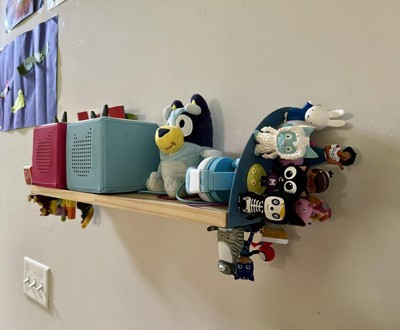 The Pillowfort wood shelf is versatile you can switch the blue brackets facing up or down. It is small in size but can fit many items. My daughter can put all her pups on the shelf. I think I am going to get a matching shelf.